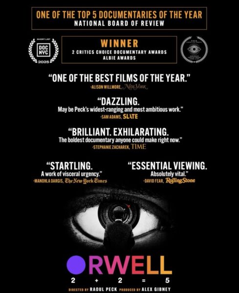Orwell: 2 + 2 = 5, documentarul regizorului Raoul Peck, a debutat în premieră la Festivalul de film de la Cannes în mai 2025, avându‑l pe actorul Damian Lewis ca vocea principală a lui George Orwell. Filmul reconectează opera și viața scriitorului la crizele actuale ale democrației, manipulării informaționale și autoritarismului, reușind să atragă atenția publicului larg și a criticilor.