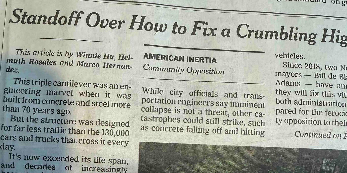 Seria *American Inertia* a prezentat starea precară a Brooklyn‑Queens Expressway (BQE). Articolul subliniază întârzierile din renovarea unui viaduct vechi, atribuindu‑le opoziţia locală.